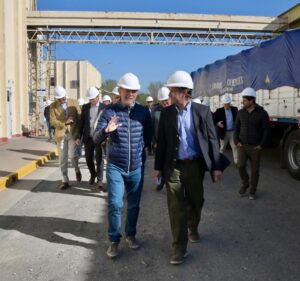 Bahillo, Rodríguez y otros funcionarios recorren la planta de clasificación de semillas de maíz de la Asociación de Cooperativas Argentinas (ACA) de Pergamino.