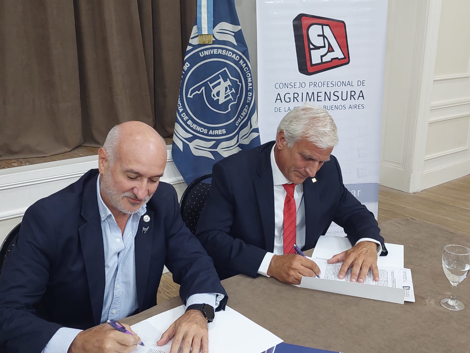 La firma del convenio se realizó en el Aula Magna de la UNICEN, en la ciudad de Tandil, además del Rector de la Universidad y del Presidente del CPA, participaron la Decana de la Facultad de Ingeniería, Dra María Peralta; la Directora del Departamento de Agrimensura e Ingeniería Civil, doctora Vivina Rahhal y el coordinador de Ingeniería en Agrimensura, agrimensor Carlos Melitón.