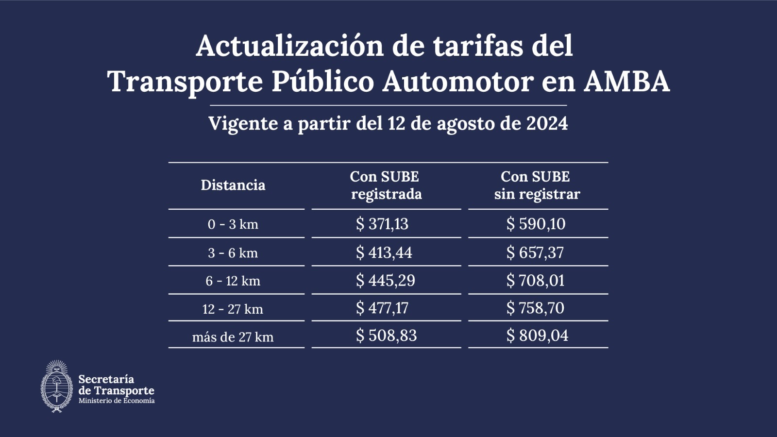 El gobierno nacional oficializó el aumento del 37,5% en el boleto de colectivos para el Área Metropolitana de Buenos Aires (AMBA) que empezará a regir desde el lunes 12 de agosto, a través de la Resolución 25/2024 publicada en el Boletín Oficial.