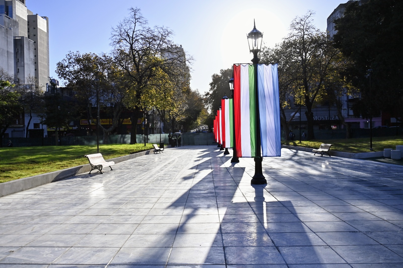 La obra de reconstrucción de Plaza Italia contempló la renovación completa de los solados, incorporando nuevas baldosas graníticas de 60 por 60 centímetros que ordenaron y jerarquizaron los recorridos peatonales.