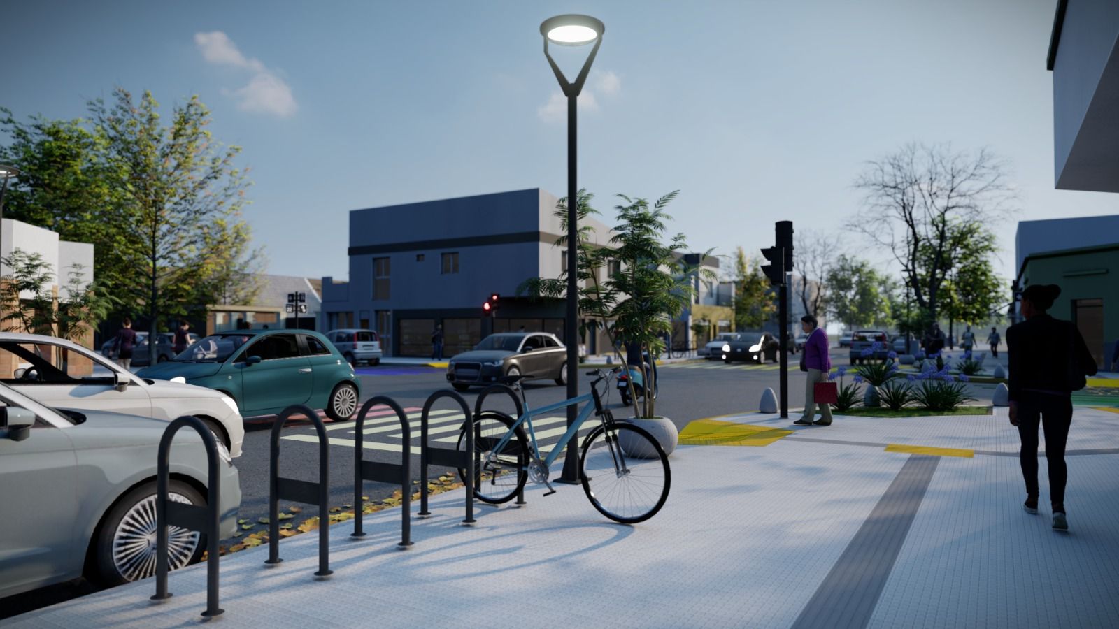 La intervención incluye la renovación y expansión de veredas, la colocación de luminarias con tecnología LED, forestación y plantación de arbolado, la instalación de nomencladores, demarcación de calzada, rampas en esquinas y mobiliario urbano como bancos, cestos de residuos, bolardos y bicicleteros.